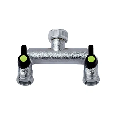 Mosadzný rozbočovač s guľovými uzávermi a 2x výstupem s vonkajším závitom. Na pripojenie záhradných hadíc s hadicovými spojkami, záhradnými kohútikmi alebo rôznymi závitovými spojkami. Adaptér umožňuje rozdelenie hadicového systému na 2 vetvy. Pripojovací závit kohútikov je 3/4“ alebo 1“